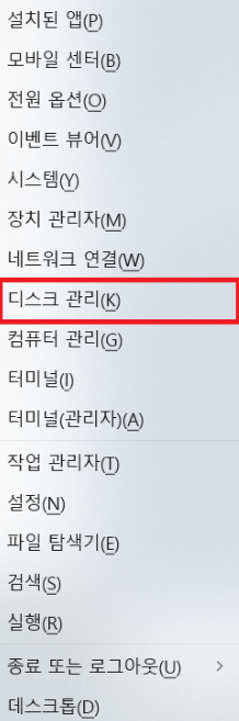 1. 외장이든 내장이든 하드디스크가 컴퓨터에 연결됐는지 확인하기. 윈도우 키 + X키를 동시에 누르고 목록에서 "디스크 관리"를 클릭한다.