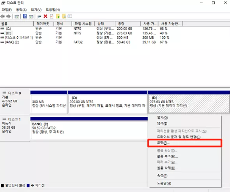 디스크 관리자를 이용해서 하드디스크 포맷하기